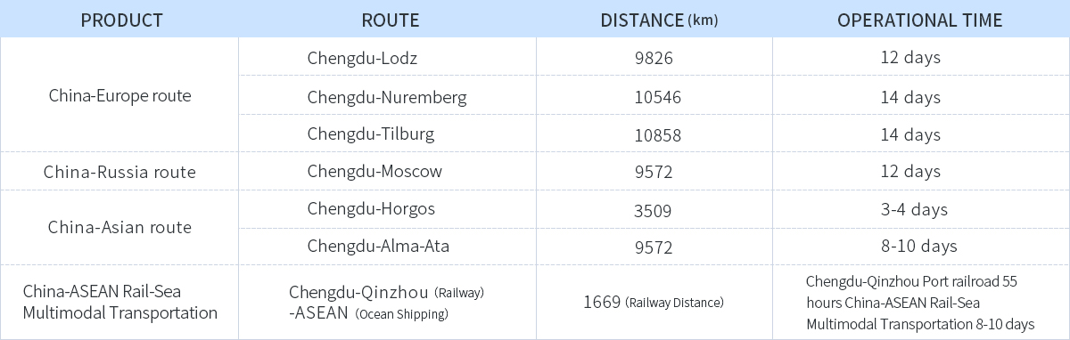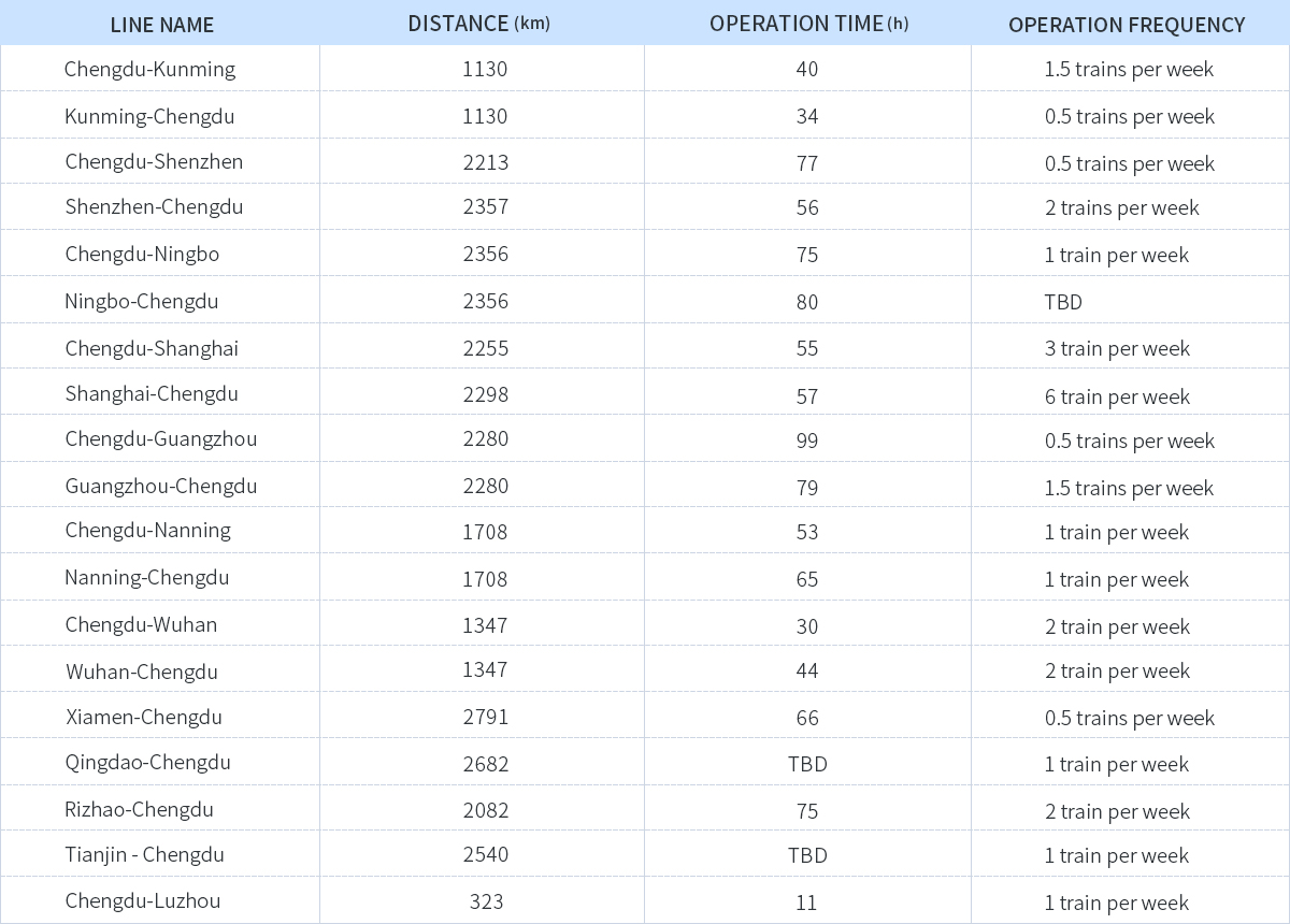 Trains corridors featuring high-speed, containerization, and normalization connecting Chengdu to such 12 coastal and border cities as Shanghai, Ningbo, Shenzhen, Kunming, Wuhan, Guangzhou, Nanning, Rizhao, Tianjin, Qingdao, and Xiamen have been completed and run stably weekly.